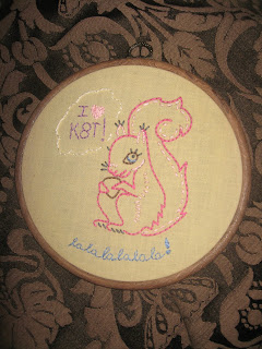 happy birthday, katie! for a dear friend's birthday, i made her a forest friend from sublime stitching. she loves pink. so.... why not make a fuzzy squirrel?? i used a running stitch, a back stitch (my favorite!), and a stem stitch (have been working on improving that technique).